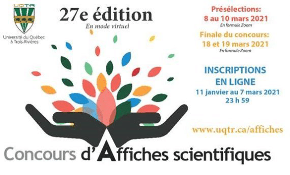Les 18 et 19 mars derniers a eu lieu la finale de la 27e édition du Concours d’affiches scientifiques de l’Université du Québec à Trois-Rivières (UQTR). Tout l’événement s’est déroulé entièrement à distance, parfois en mode asynchrone et d’autres fois en mode synchrone. Ce sont 31 finalistes détenteurs d’un prix de comité de programme, soit 10 du premier cycle et 21 des cycles supérieurs, qui ont eu l’honneur de présenter leur affiche devant un comité d’évaluateurs regroupés par secteur et cycle.