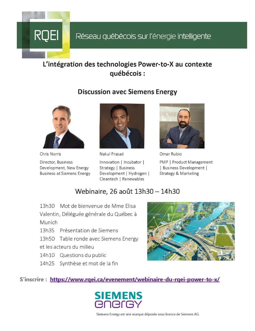 Le Réseau Québécois sur l’Énergie Intelligente (RQEI) a organisé un webinaire avec Siemens Energy sur l’implantation des technologies « Power-to-X » (P2X) dans le monde et spécialement au Québec. Ces technologies et un partenariat potentiel avec Siemens Energy sont particulièrement intéressants pour l’UQTR, nos proches collaborateurs et plusieurs de nos projets de recherche et de projets d’ancrage avec le milieu.