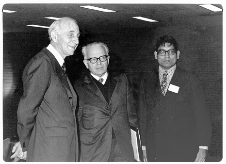 Alfred Kastler et Gerhard Herzberg en compagnie de Tapan Bose, lors du colloque « Optique et laser »