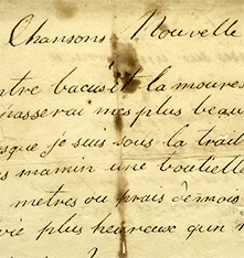 Les pratiques chansonnières sont difficiles à appréhender à l’époque coloniale, dans la mesure où elles revêtent une dimension essentiellement orale et laissent donc peu de traces dans les archives. Leur étude constitue pourtant un observatoire privilégié pour étudier les processus de transferts, d’appropriation, de transmission et de renouvellement dans une perspective sociale et culturelle. Les mécanismes de circulations orales des chansons sont particulièrement riches d’enseignements dès lors qu’ils sont intégrés à la dynamique plus vaste des échanges entre Europe et Amérique, de la Louisiane à l’Acadie en passant par les Caraïbes et la vallée du Saint-Laurent.